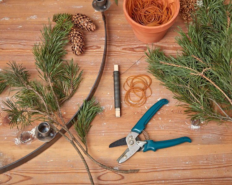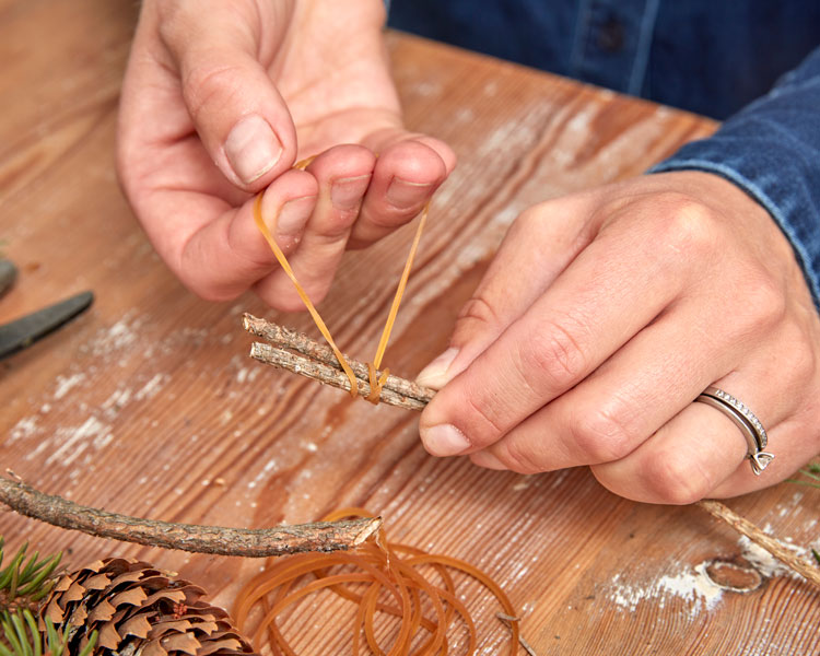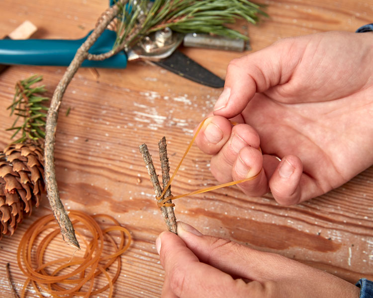 1. Klipp två lika långa kvistar av exempelvis tall, de ska vara cirka 20–25 cm.