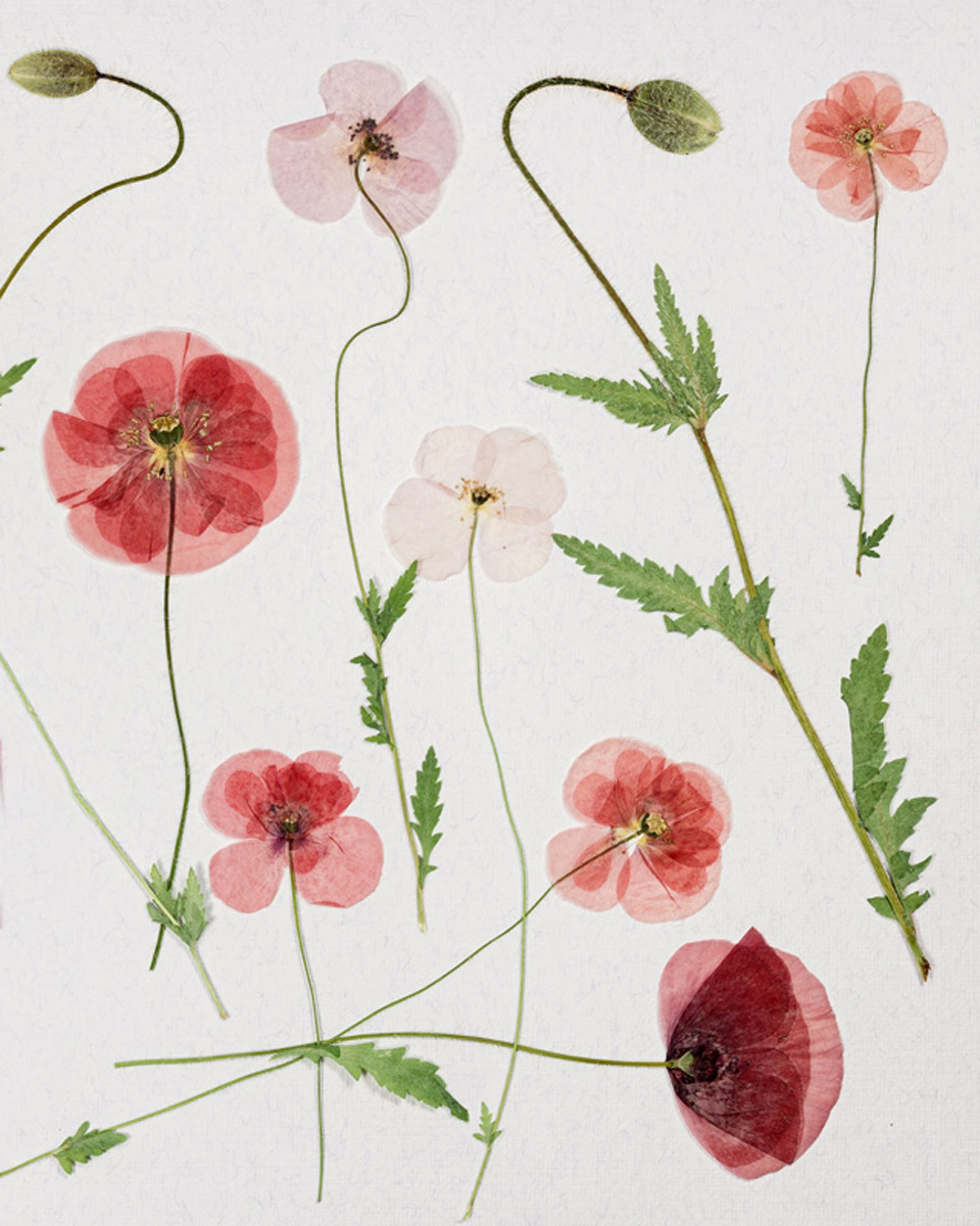 Platta och enkla blommor är lättare att pressa än bulliga och runda. Välj till exempel vallmo, smörblomma, rosenskära, styvmorsviol, riddarsporre och klematis. Gröna blad från ormbunke är också dekorativa. I blomsterbutiken finns fler fina sorter!