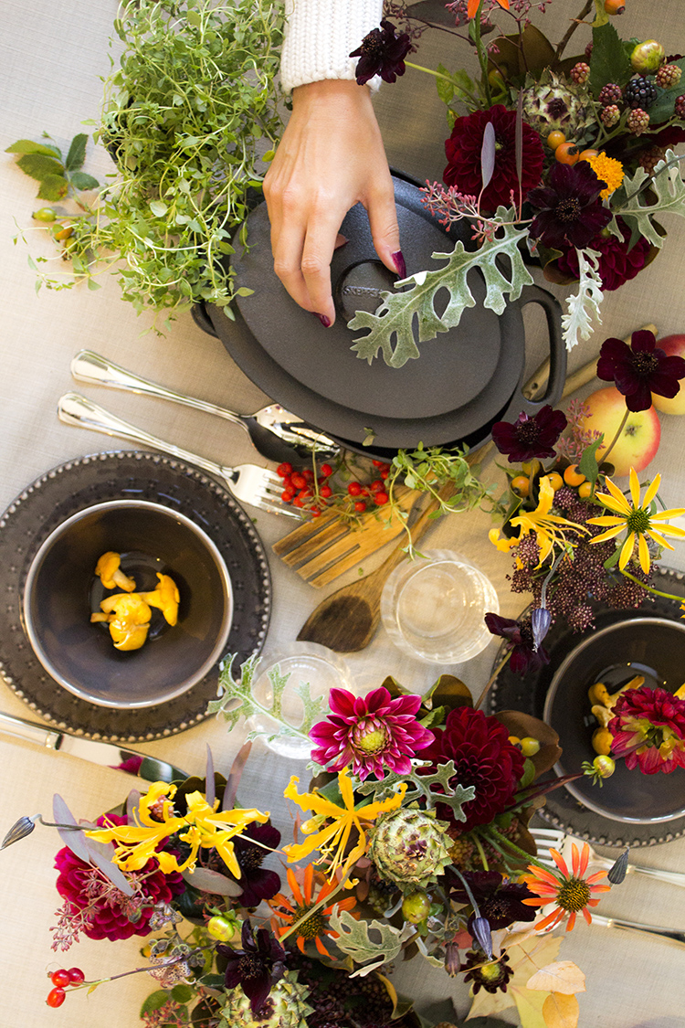 En oblekt linneduk är en fin grund för dukningen, som har ett naturligt tema. Det som kanske inte passar in kan alltid kamoufleras – här har till exempel några magnoliablad nålats ihop som ett foder runt en vas.