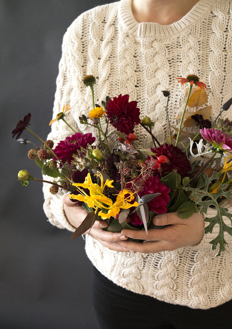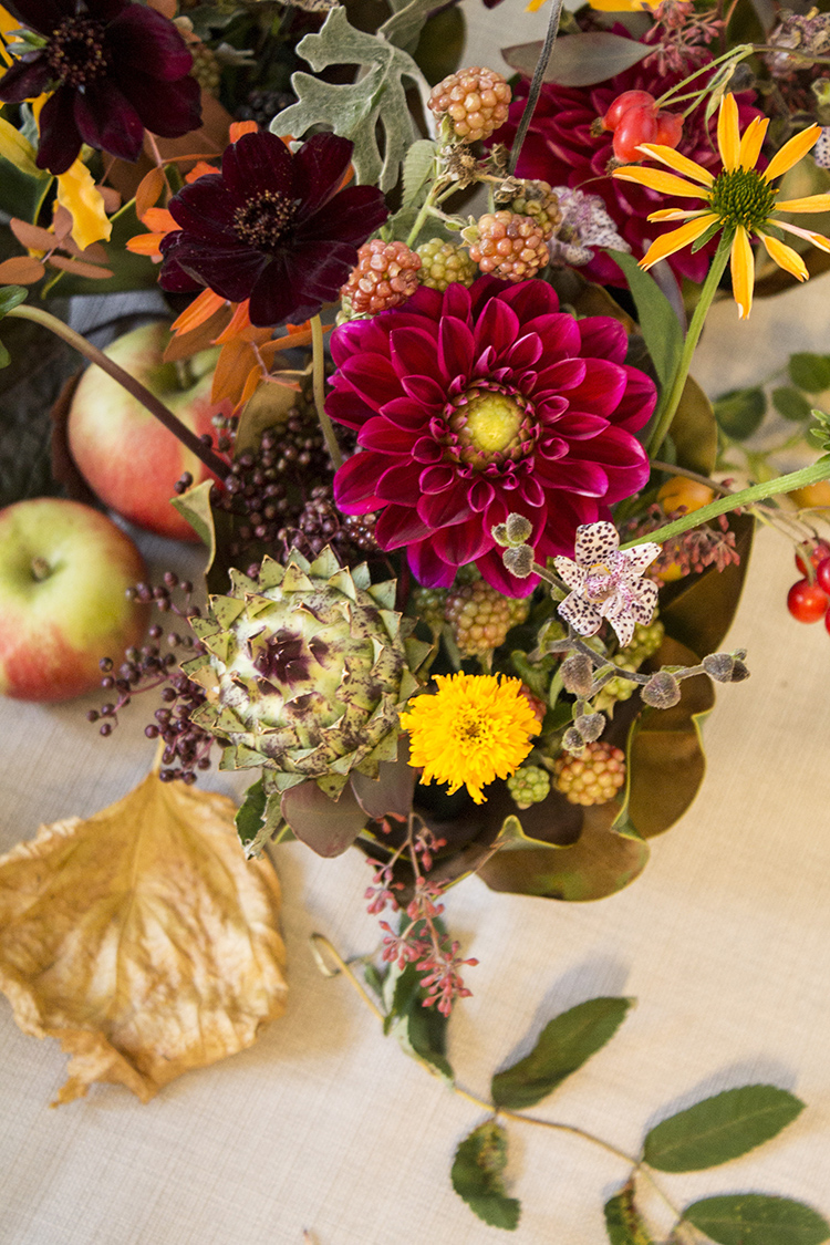 – Jag föredrar en blandning av många sorters blommor i olika färger. Hellre purpur, vinrött och brunt än starkt orange och rött, som många vanligtvis förknippar med den här säsongen. Tillsammans med bär och frukter av olika slag förstärks den höstiga känslan, säger hon.