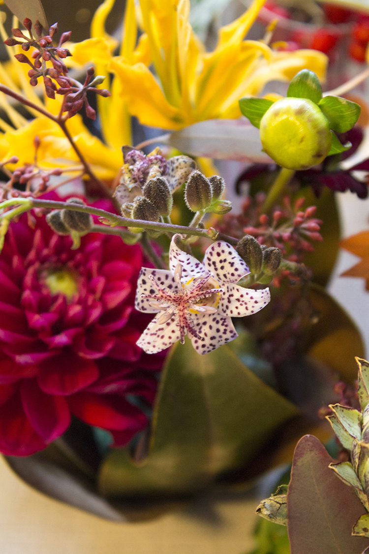 – Hösten är så mycket mer än orange, gult och rött. Jag vill gärna ha djup i färgerna, säger floristen Sofie Danielsson Söhr som skapat de vackra binderierna.