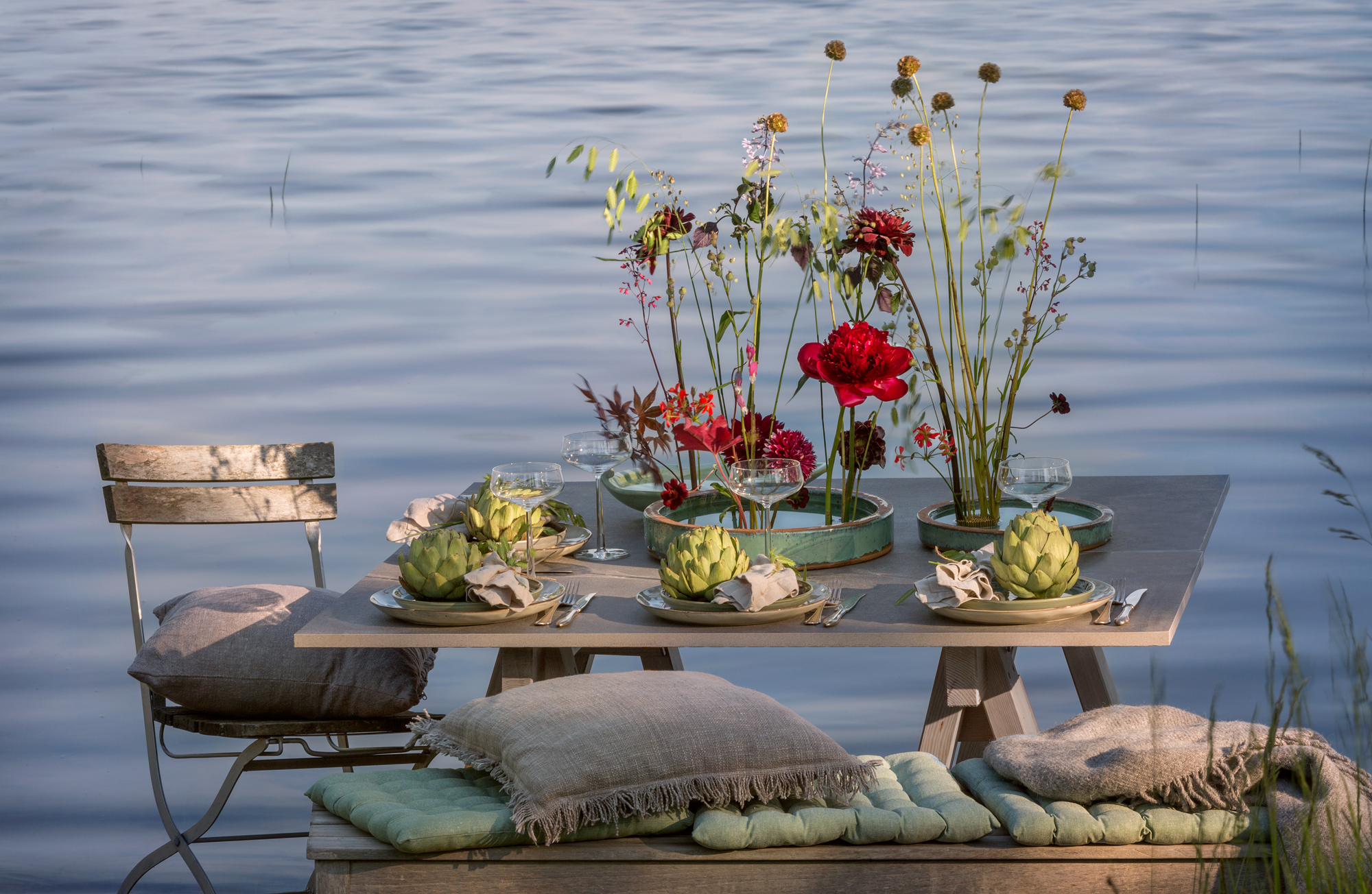 Blommor i dukningen: Hallonkvistar, stäpplilja, solrosor, pioner, dahlia, liten protea, scabiosa, blomstermorot, kvistros, olika gräs