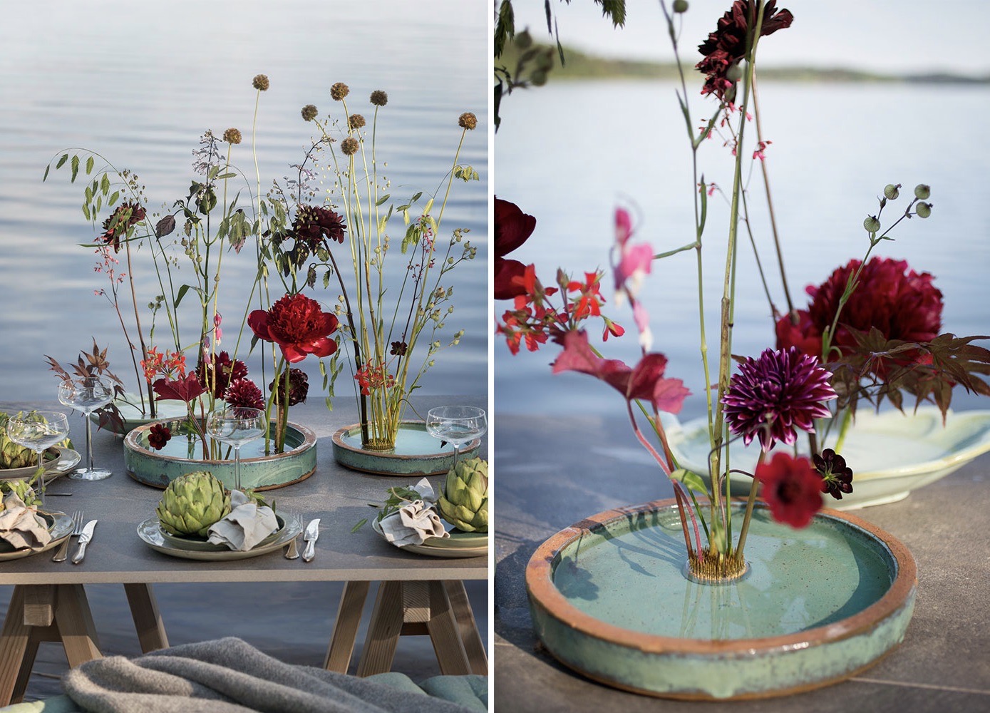Det här är en tacksam dukning som inte kräver så mycket blommor. Här arbetar du med vackra fat i olika storlekar och färger som går ton i ton. Med hjälp av fakirer i olika storlekar som är placerade i faten, dekorerar du med ett fåtal blommor. Om man använder sig av blommor med lite olika karaktär, storlek och höjd får man en stilren och elegant känsla. Vattenspegeln i faten skapar en stämningsfull effekt i dukningen.