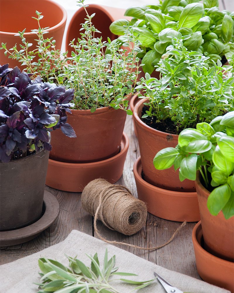 Prydnadsgräs, lavendel, murgröna, alunrot,uppstammad myrten och palettblad är fina ihop med örter som basilika, rosmarin och salvia.