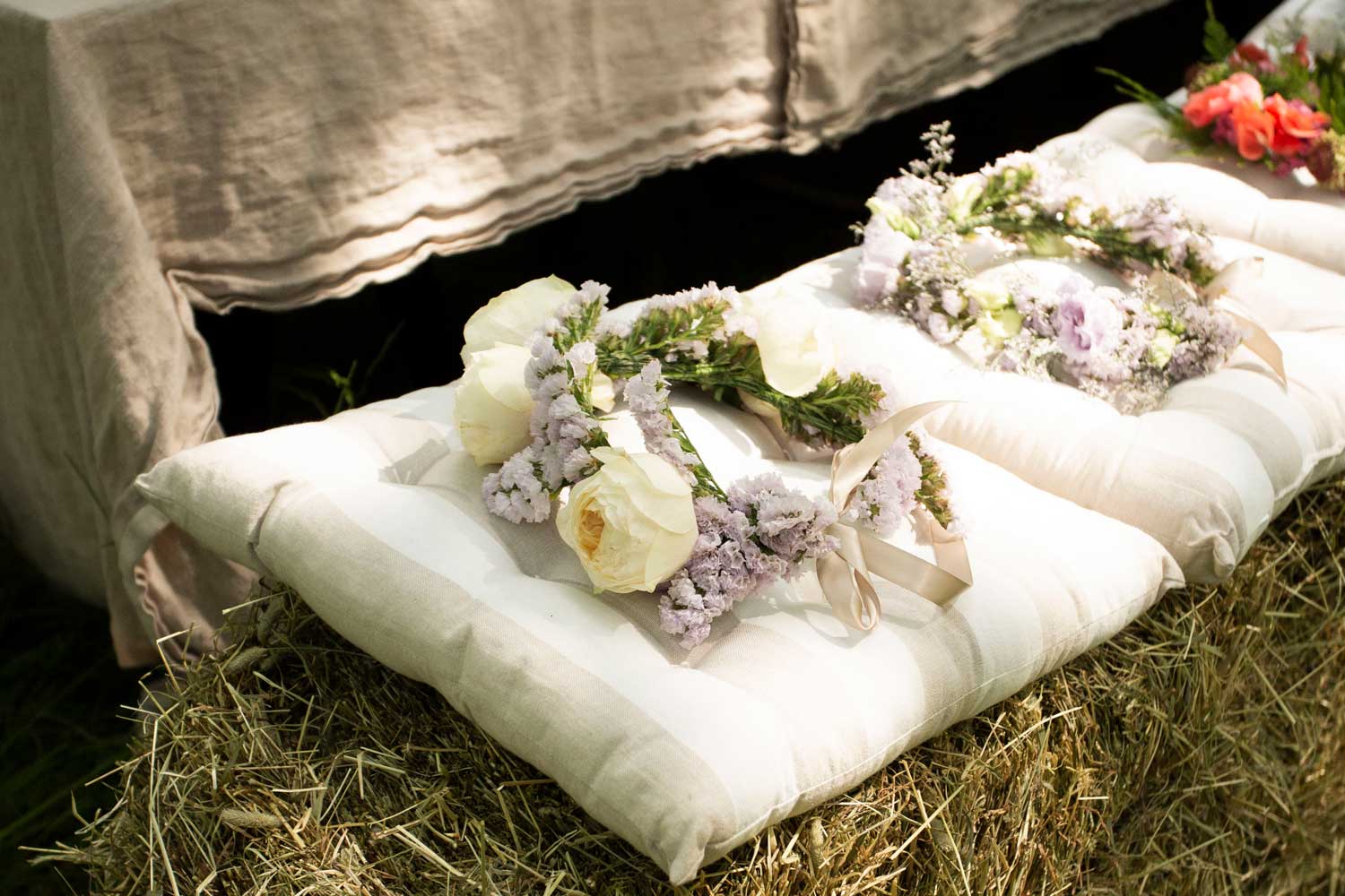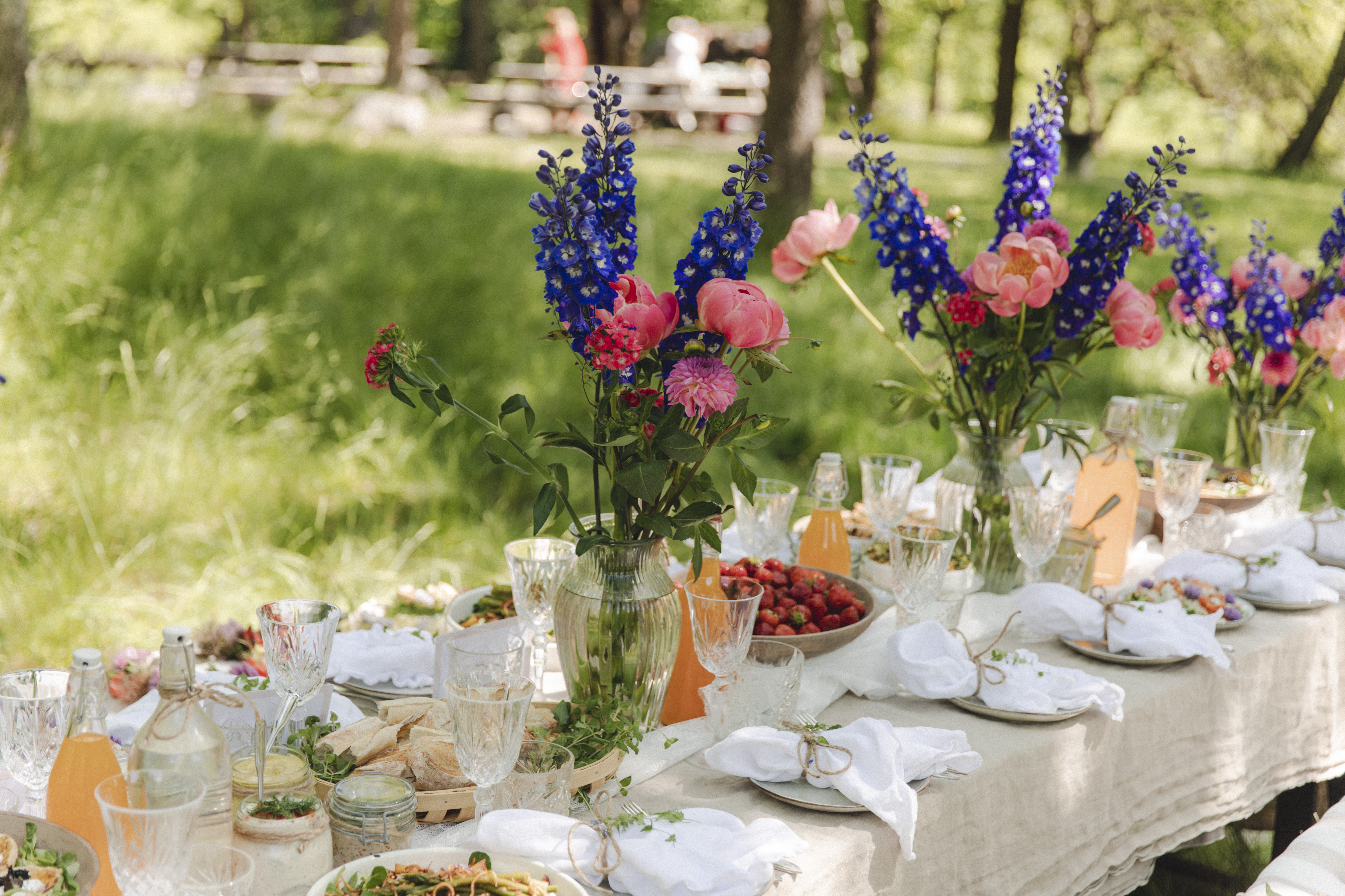 En vacker detalj är att sticka in en mindre blomma eller kvist i varje gästs servett som de kan sätta i håret eller i kavajfickan för att känna sig midsommarfina. Ett enkelt sätt att tillföra grönska!